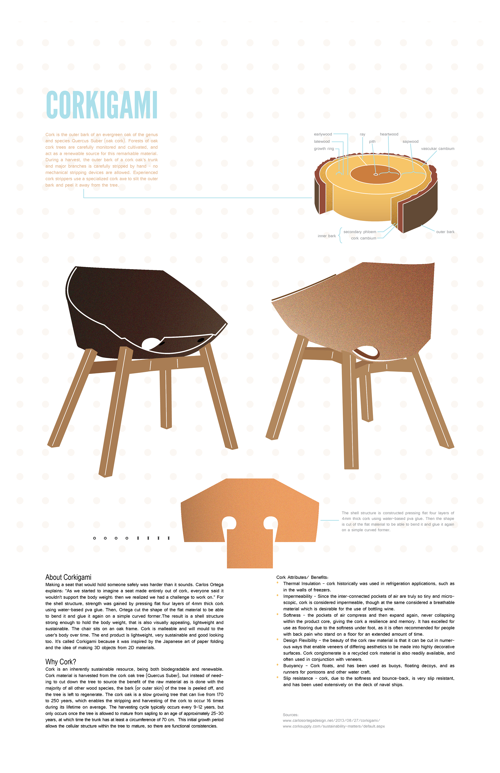 Object study on Corkigami, chair design by Carlos Ortega. Gives specifics on the chair and shows the benefits of using cork.